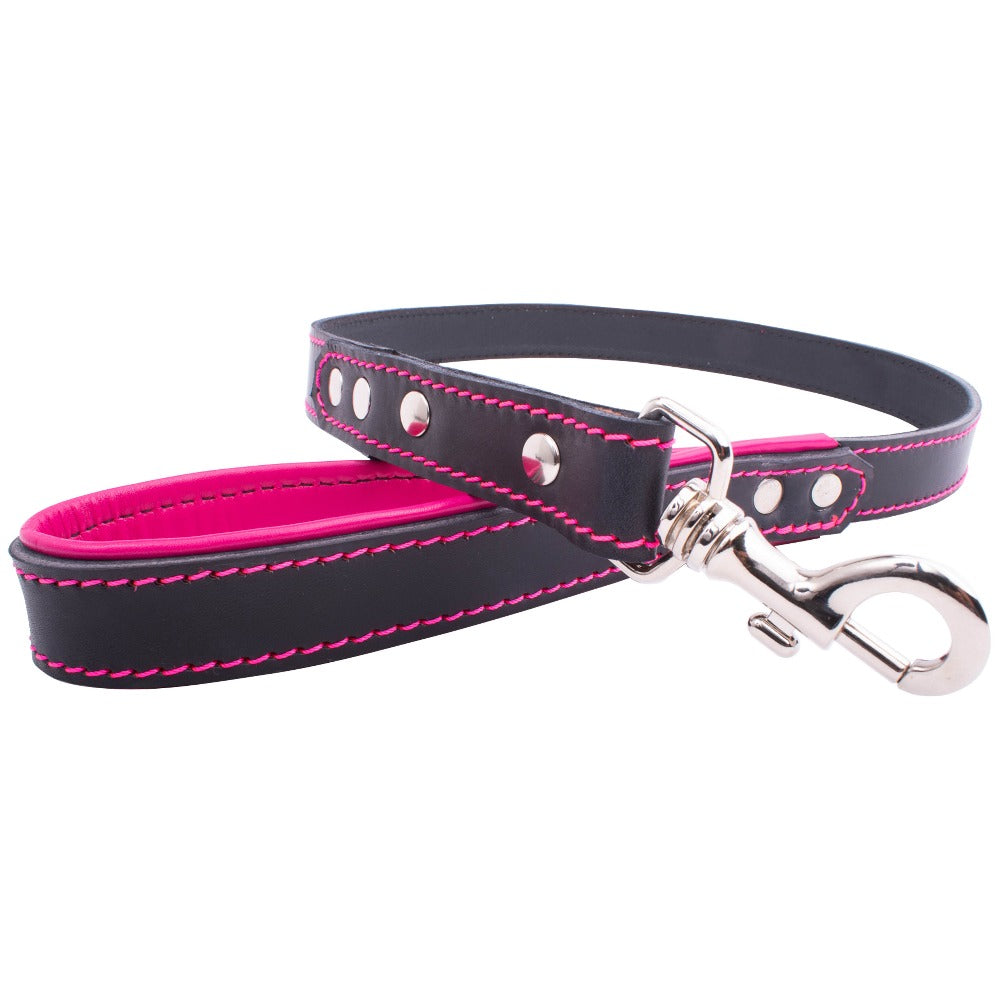 Black leather strap, interior lined with leather. The handle incorporates padding lined with pink leather and the whole is sewn with pink thread.